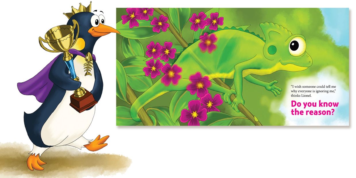 Lonely Lionel the chameleon is feeling very unhappy. All the animals in the zoo have lots of friends, but they all seem to ignore him.